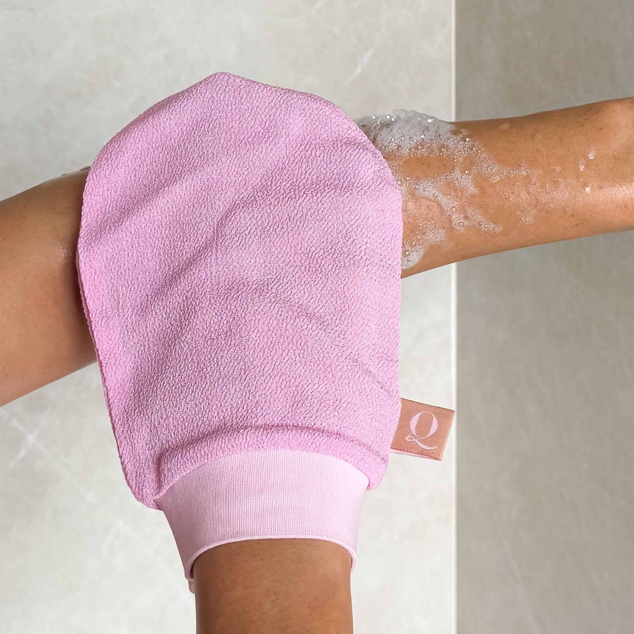 - Exfoliating mitt buffs away dry skin
